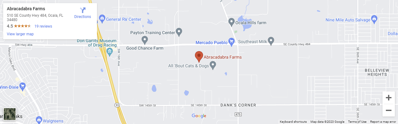 Abracadabra Farm is located in Ocala, Florida - Exit 341 Interstate 75, Go east 1.6 miles on Hwy. 484, entrance on right.
